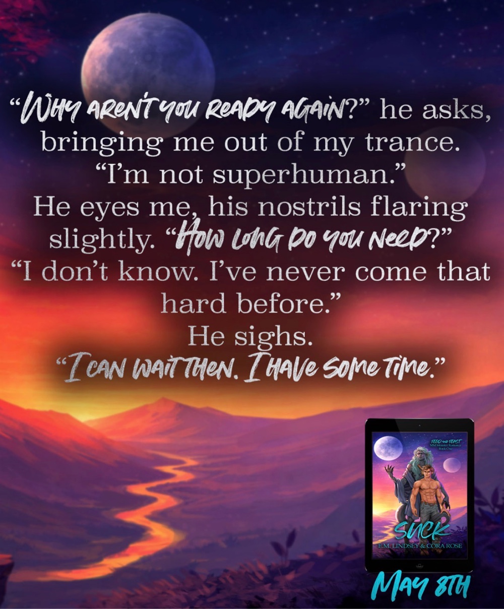 Suck is the first book in the MM Monster Romance series Feed and Feast. It contains a clueless human who’s just looking to do his duty for humanity, a naïve monster who has no idea how much humanity will change him, so much sucking, swooning, antagonists to lovers, cuddling as a love language, body piercings, secret romance, and a toe-curling happily ever after.