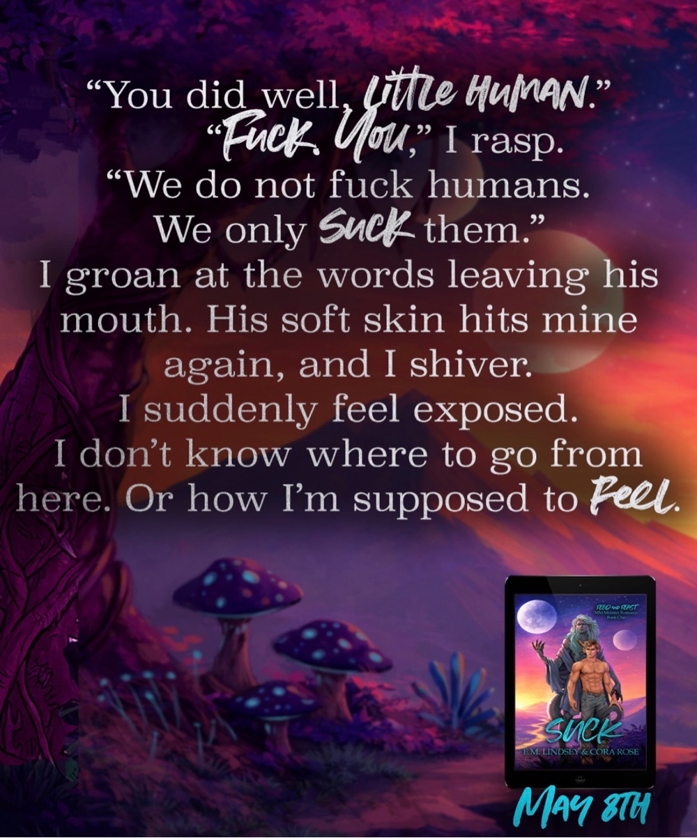 Suck is the first book in the MM Monster Romance series Feed and Feast. It contains a clueless human who’s just looking to do his duty for humanity, a naïve monster who has no idea how much humanity will change him, so much sucking, swooning, antagonists to lovers, cuddling as a love language, body piercings, secret romance, and a toe-curling happily ever after.
